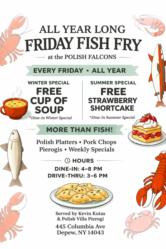 Check out our menu for all your favorite options. We offer various seafood dishes including Fish Fry – Battered, Breaded or Broiled (various options), Assorted Seafood Platter, Polish favorites including homemade Pierogi, Golabki, Fresh & Smoked Sausage. We also offer Beef on Weck, BBQ Hamburgers and much more. Get started with an order of homemade Crab Stuffed Mushrooms or our indulgent homemade Onion Rings.